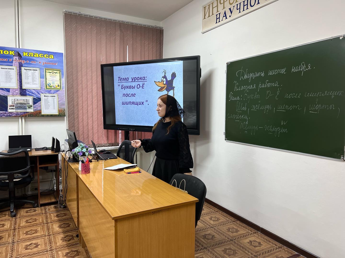 Открытый урок на тему: «Буквы О и Ё после шипящих в корне слова».В рамках недели русского языка и литературы в 5 «в» классе провела учитель русского языка и литературы Газуева Иман Исламовна .