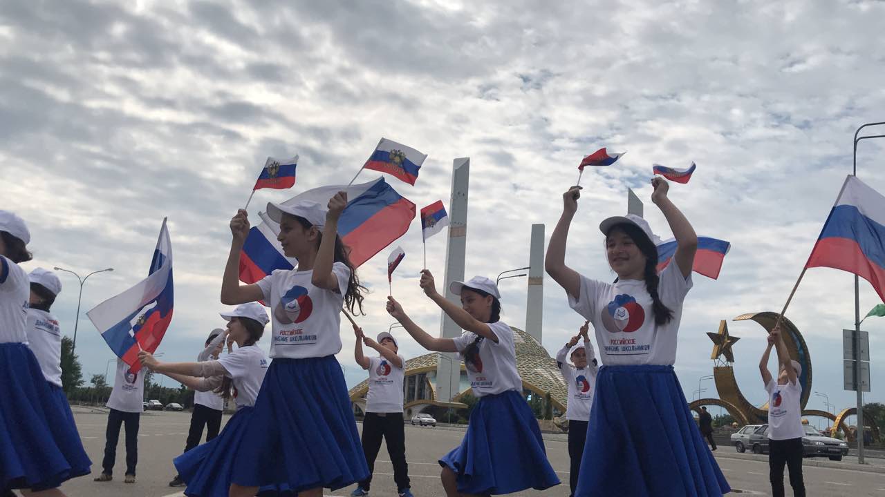С праздником России всех!!!Наши обучающиеся МБОУ «СОШ1» ,активисты РДШ провели в центре города Аргун флешмоб ,приуроченный ко дню России.